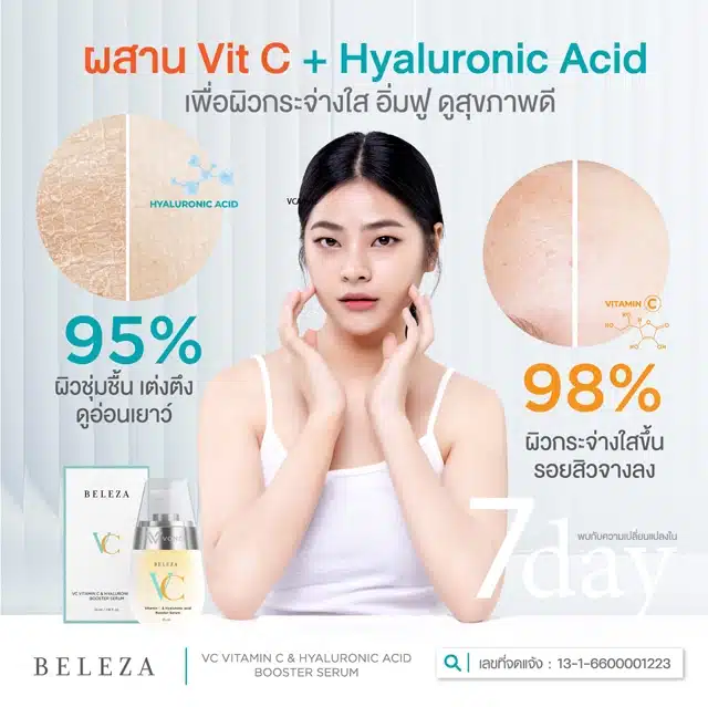 Beleza VC Vitamin C & Hyaluronic Acid Booster Serum เบเลซ่าวีซี เซรั่มบำรุงผิวหน้า ที่อุดมไปด้วยวิตามินซี มีคุณสมบัติในด้านการบำรุงผิวหน้าให้ขาวสว่าง กระจ่างใส ซึมสู่ผิวเพื่อเข้าไปกระตุ้นการทำงานของเซลล์ผิวหน้าให้ดีขึ้น เติมร่องลึกให้ดูอิ่มฟู และทำงานได้อย่างปกติคงไว้เพียงใบหน้าที่แลดูกระจ่างใส และสุขภาพดี
