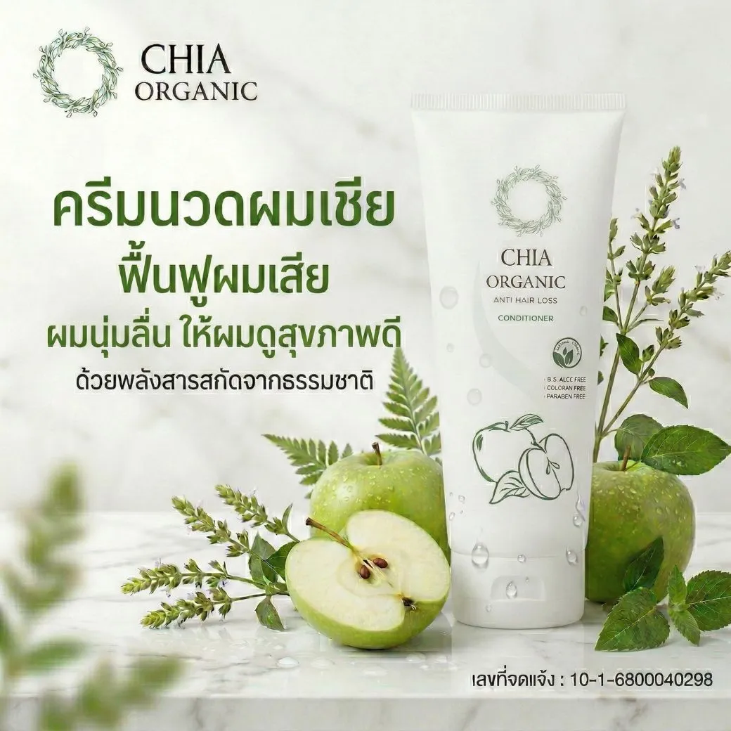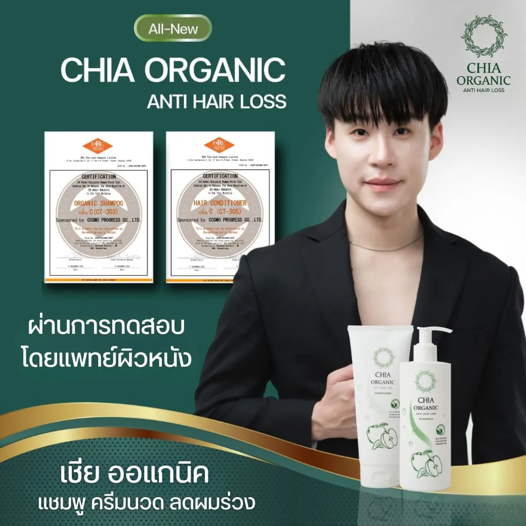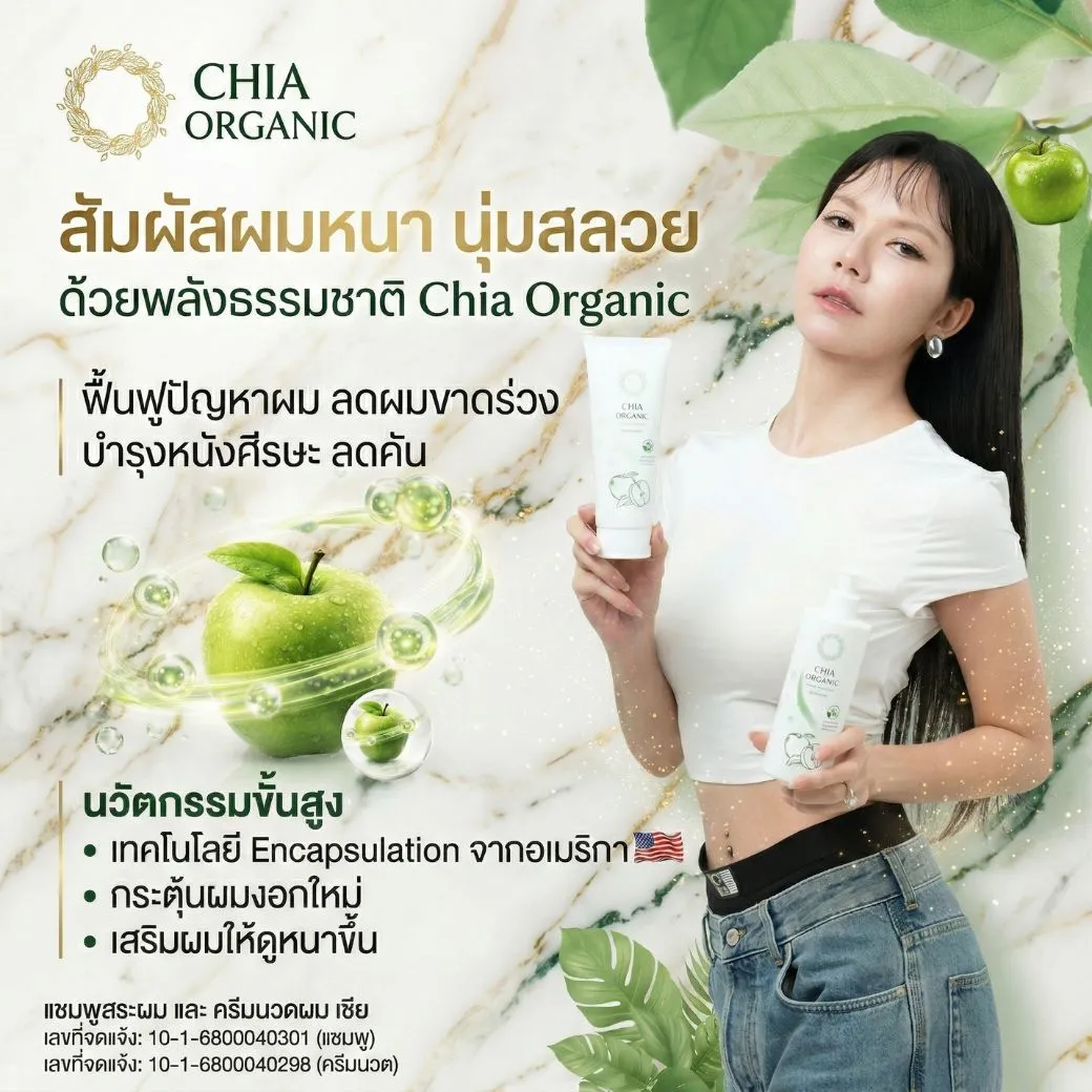 CHIA Organic (เชีย ออร์แกนิค) แชมพูและครีมนวดผมสูตรออร์แกนิค 100% ที่ผสานพลังธรรมชาติเข้ากับเทคโนโลยี Encapsulation จากอเมริกา ช่วยแก้ปัญหาผมร่วงจากต้นเหตุ ฟื้นฟูรากผมให้แข็งแรง และกระตุ้นการเกิดใหม่ของเส้นผมอย่างมีประสิทธิภาพ