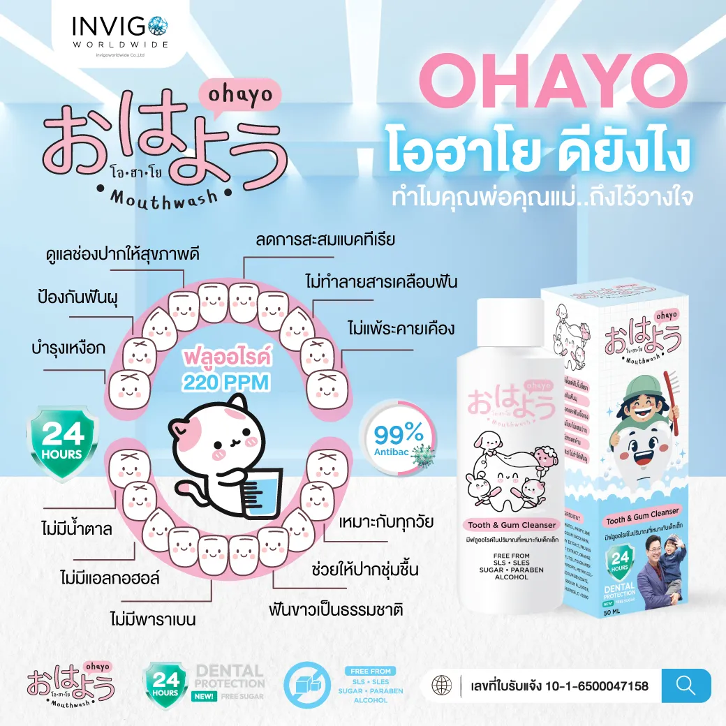 สุขภาพช่องปากของลูกน้อย เป็นสิ่งสำคัญที่ต้องเริ่มดูแลตั้งแต่ฟันน้ำนมซี่แรก การสร้างสุขนิสัยในการดูแลฟันตั้งแต่ยังเล็ก เพื่อให้ฟันแข็ง ป้องกันฟันผุ และป้องกันปัญหาต่าง ๆ ในอนาคต ผลิตภัณฑ์ OHAYO โอฮาโย น้ำยาเช็ดฟันเด็ก เป็นผลิตภัณฑ์ดูแลช่องปากลูกน้อยได้อย่างละเอียดอ่อน และมีประสิทธิภาพ ช่วยทำความสะอาดฟันและเหงือกได้อย่างล้ำลึก พร้อมป้องกันฟันผุและลมหายใจสดชื่น เหมาะสำหรับการใช้กับเด็กทุกวัยด้วยสูตรที่ปลอดภัย ผ่านการทดสอบจากผู้เชี่ยวชาญ มั่นใจได้ว่าลูกน้อยจะมีสุขภาพช่องปากที่ดีไปตลอด